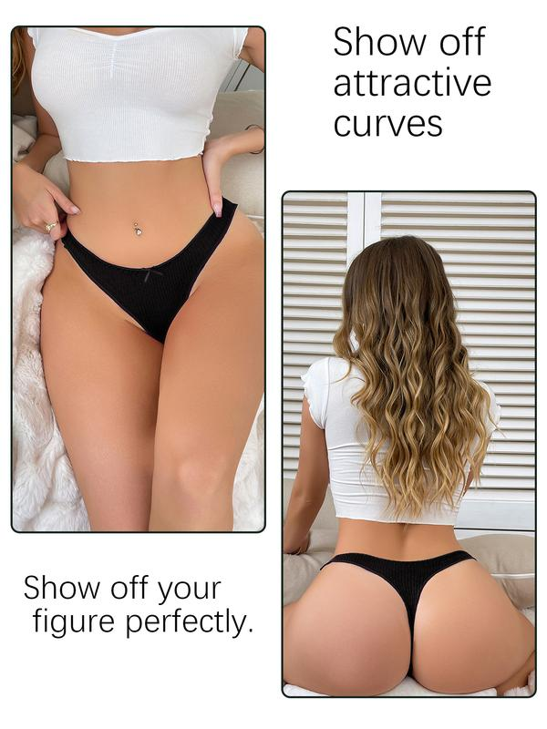 Low-rise thongs with 3D black bows, seamless & comfortable fit. Stretchy, non-pinching cotton fabric holds shape wash after wash. 9-pack for elegant daily wear.