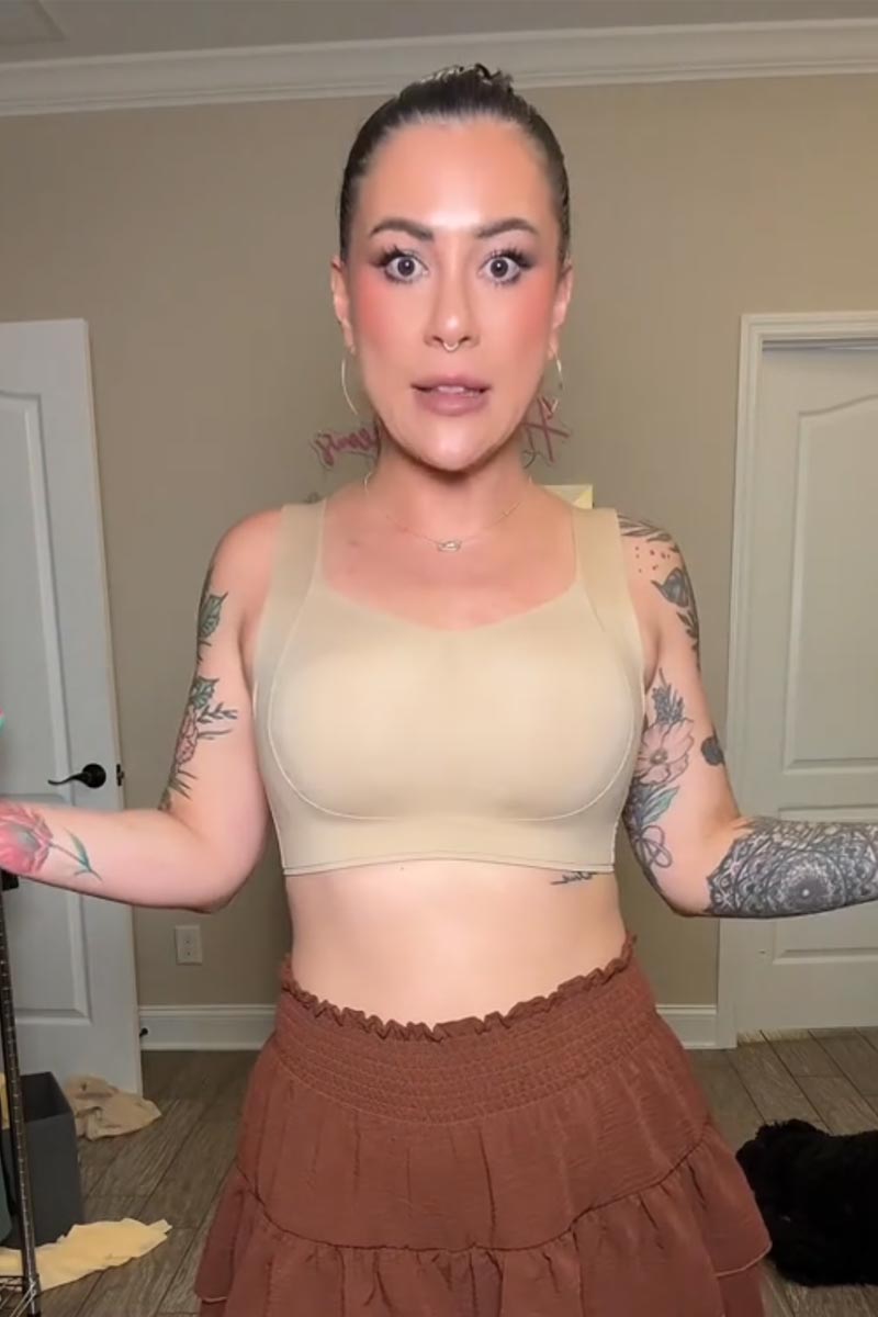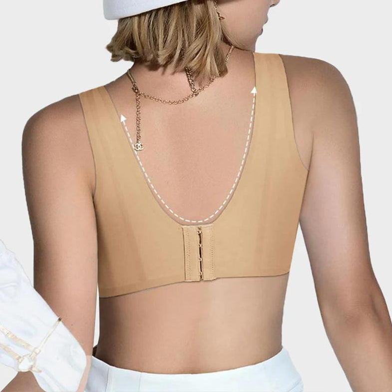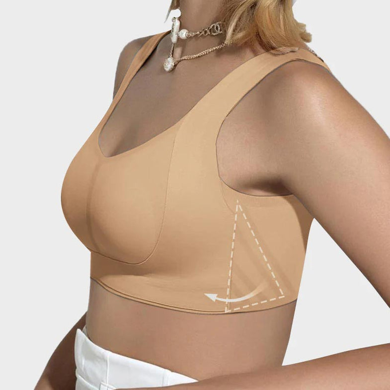 Questo reggiseno minimizer senza ferretto snellisce visivamente il seno fino a 3,8 cm. I pannelli laterali a forma triangolare e la schiena a U agiscono in sinergia per attenuare le protuberanze laterali e il grasso sulla schiena. Le coppe più ampie prevengono le fuoriuscite, mentre l'ampia e stabile fascia a W mantiene il seno sollevato in modo sicuro, il tutto senza la pressione dei ferretti.