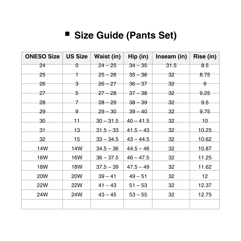 We offer a wide range of sizes fromUS 0–24W, ensuring a perfect fit for every body type. Please check our size chart for detailed waist, hip, inseam, and rise measurements.