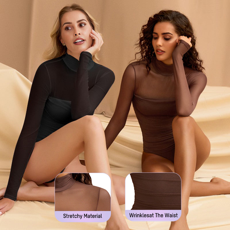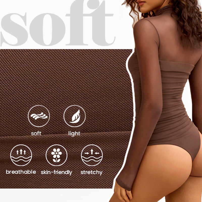 This sleek mesh bodysuit features a semi-high neckline and sheer long sleeves that strike the perfect balance between sexy and sophisticated. The mesh patchwork design highlights your curves while keeping it modern and versatile. A thong back ensures a seamless finish under any outfit, perfect with jeans, skirts, or tailored pants.