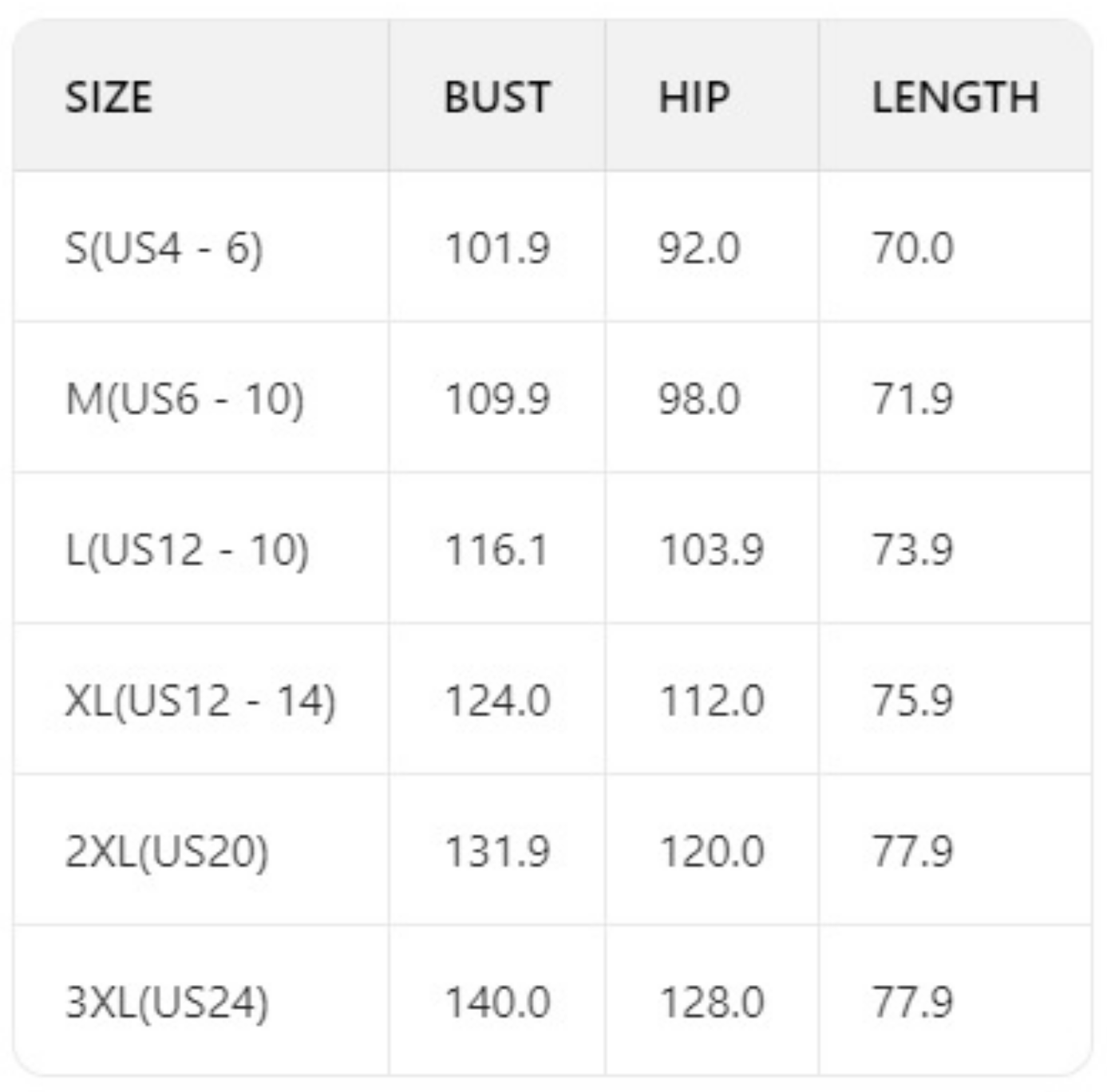 Size Chart: