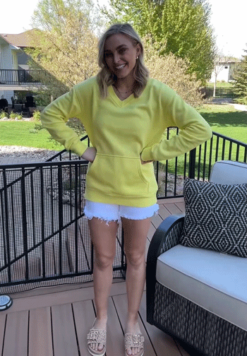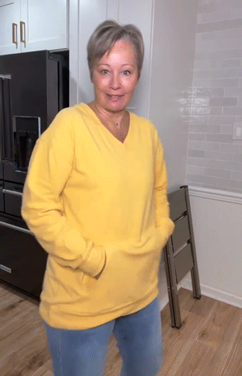 Features: Flattering V-neck design, Convenient kangaroo pocket for daily essentials, Soft, lightweight, and breathable fabric keeps you comfortable all day
