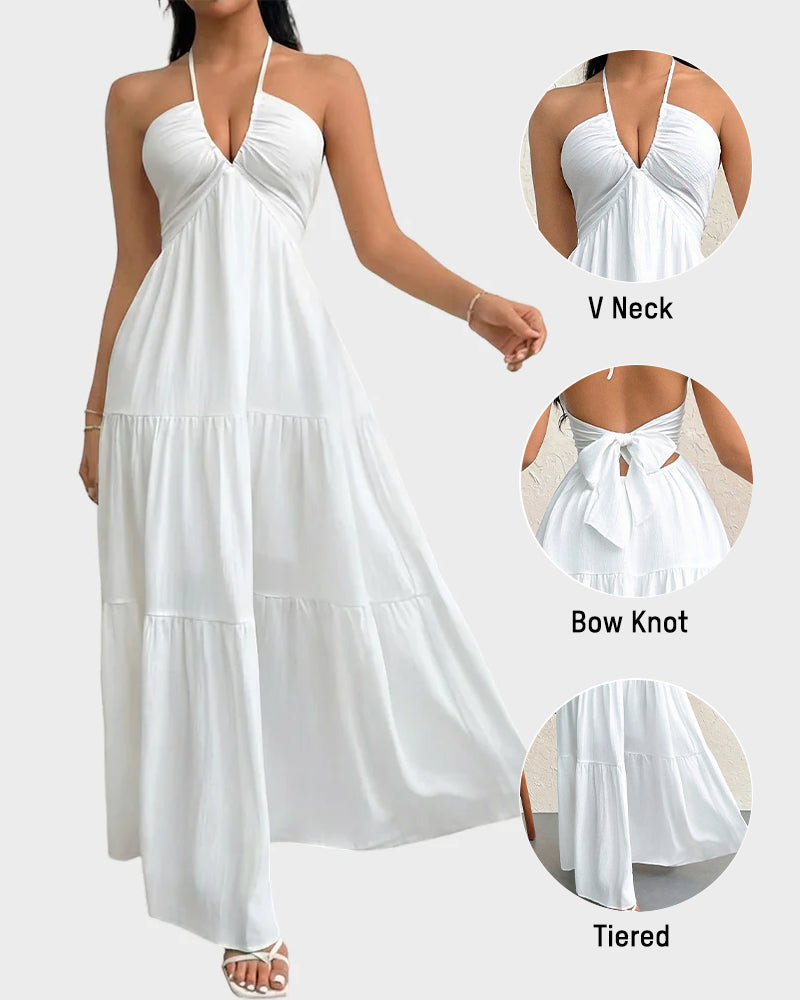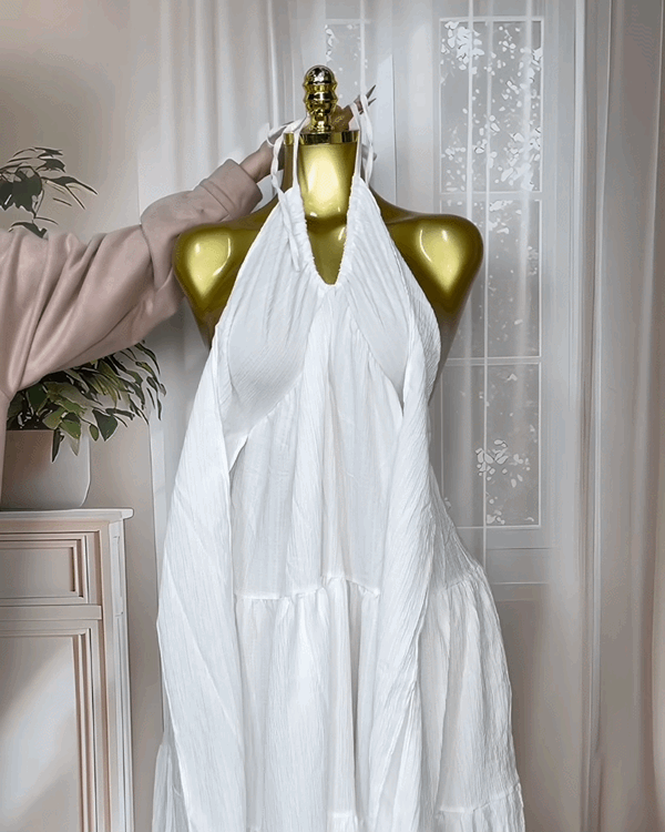 This halter maxi dress combines aflowy loose fit with an open-back statement,giving you breathable comfort and confident allure. Perfect for vacations, beach days, and easy nights out—no styling stress required.