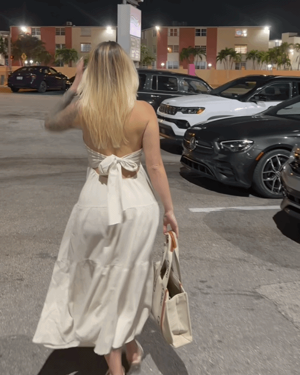 A dramatic open-back design adds instant vacation vibes, balanced by a back tie that enhances shape without feeling restrictive.